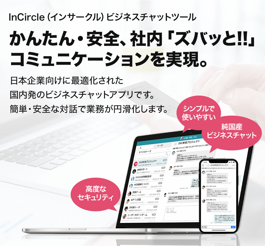 InCircleはAPIに、政府も採用する高度なセキュリティ技術を加え、人と人、人と既存ICTシステムとが、シームレスにスピーディーにつながるビジネスチャットです。